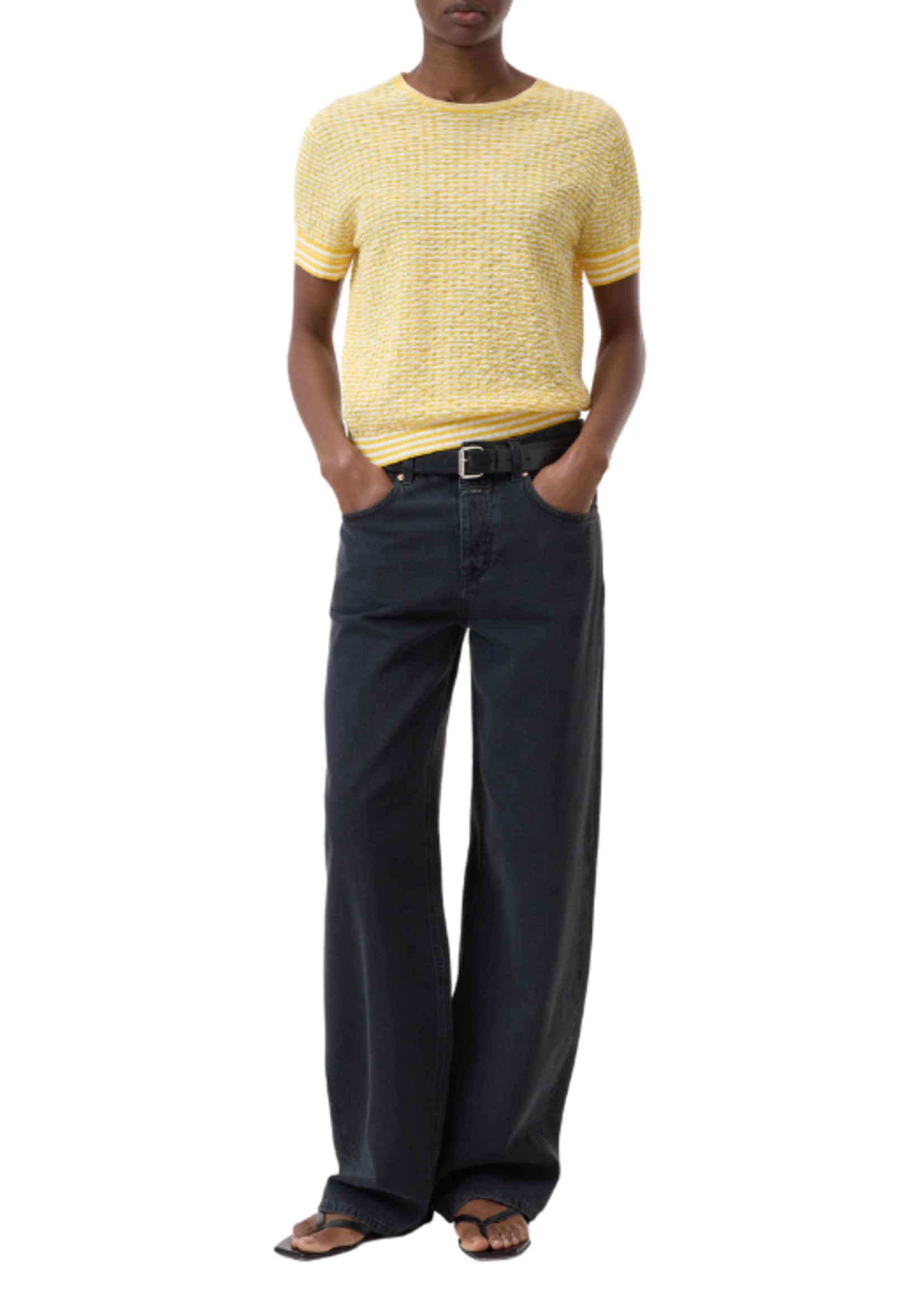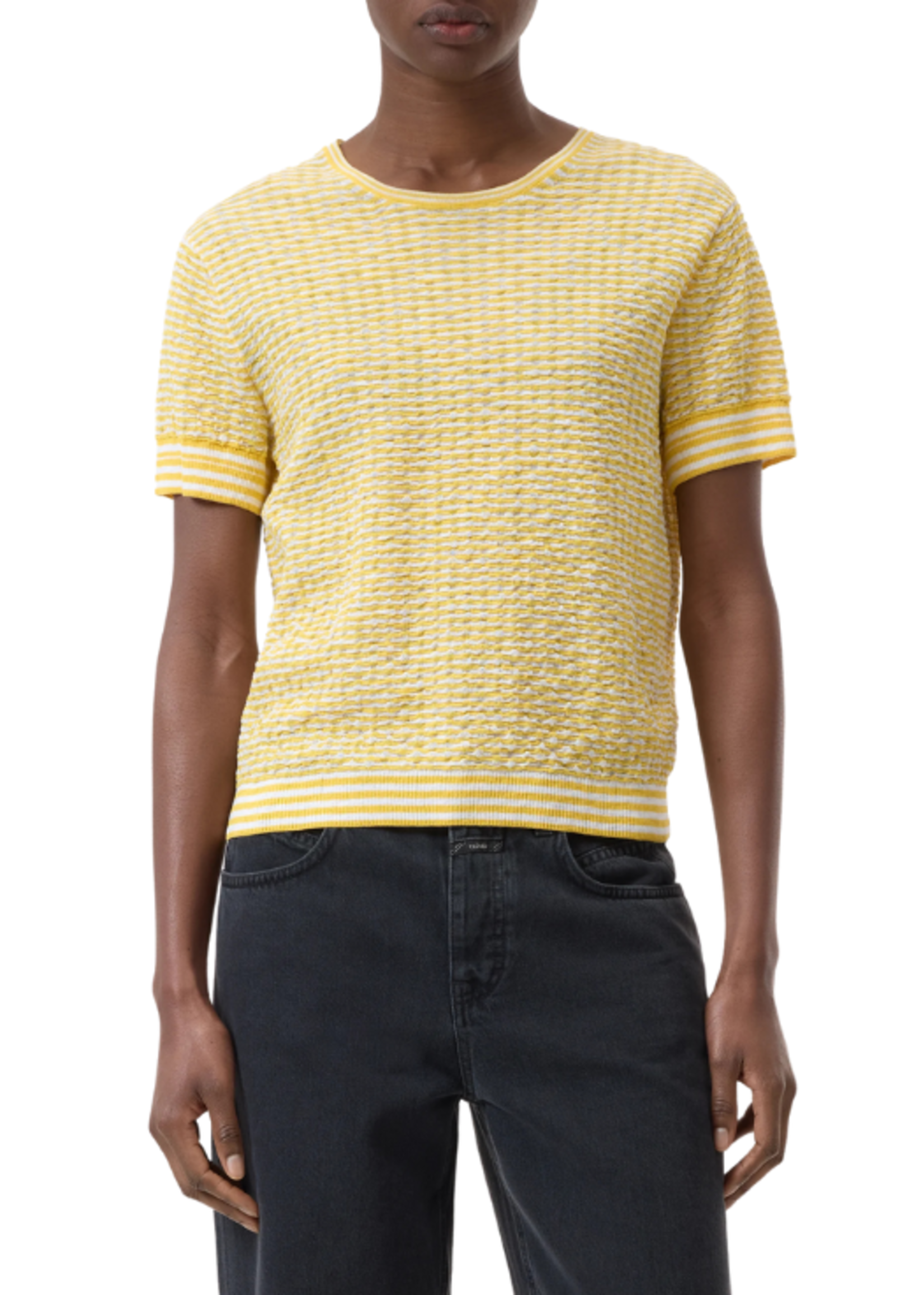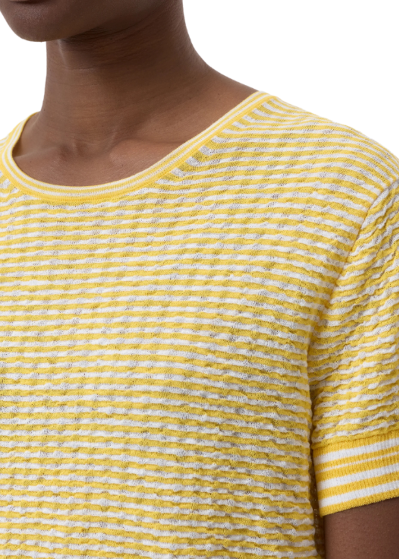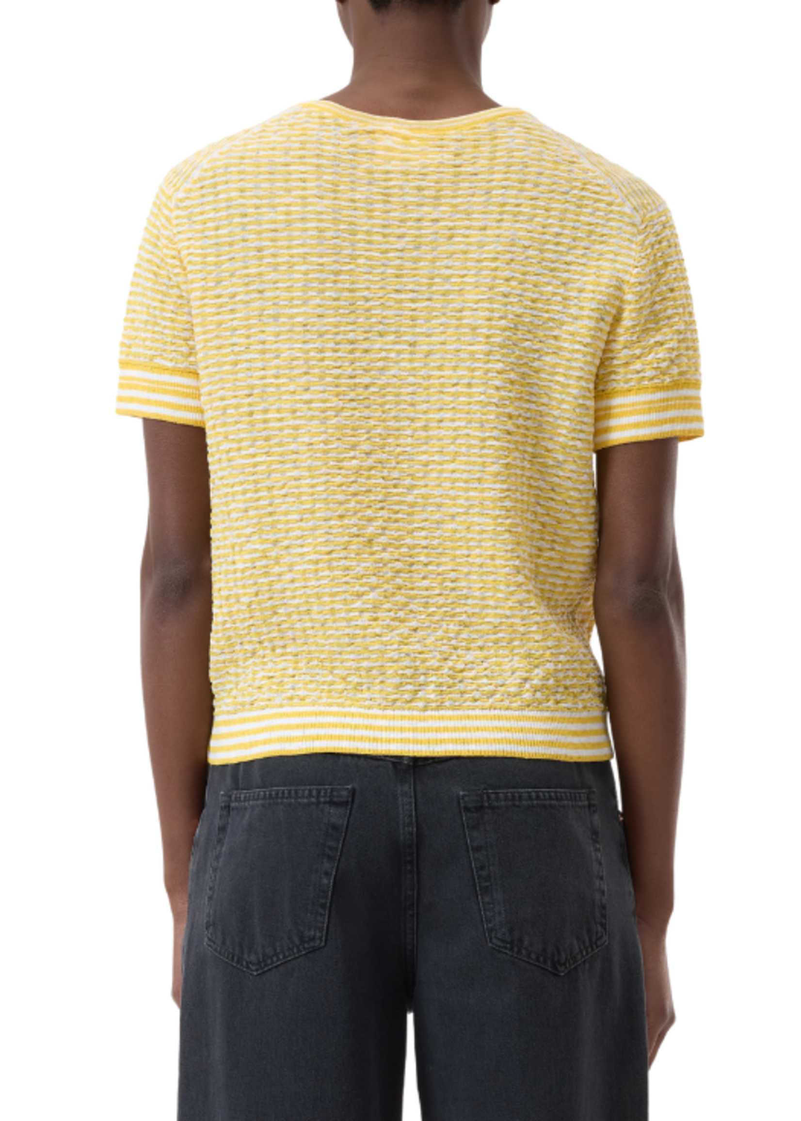 Italian flame yarn and a striped 3D seersucker look come together in this short sleeve top (16 gg). It features a slightly transparent design, a round neckline and small ribbed cuffs on the sleeves and hem.